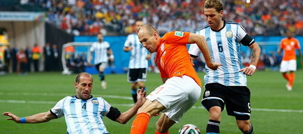 La loviturile de departajare, Messi, Garay, Aguero și Maxi Rodriguez au marcat pentru Argentina, Robben și Kuyt pentru Olanda, ratând Vlaar și Sneijder.