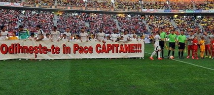 "Odihneşte-te în pace, căpitane". Fotbaliştii au pus bannerul pe teren, în faţa galeriei dinamoviste. Căpitanul Astrei, Constantin Budescu, a pus o coroană din partea clubului giurgiuvean în faţa peluzei PCH.
