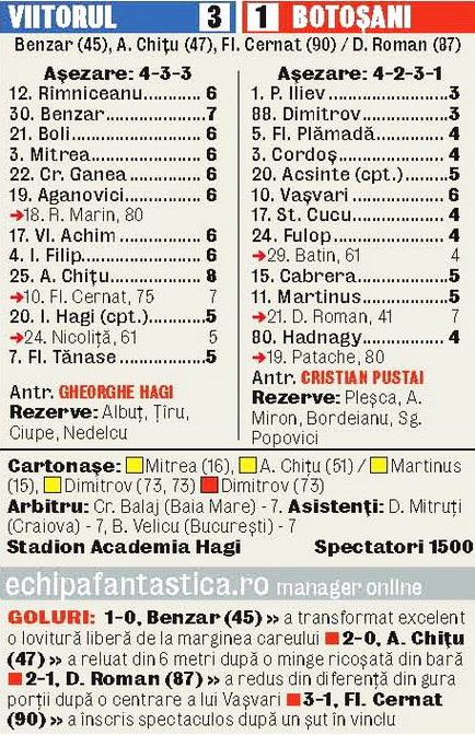 Botoşani: Iliev - Dimitrov, Cordoş, Plămadă, Acsinte - Cucu, Vaşvari - Fülöp (61 Batin), Cabrera, Martinus (41 D. Roman) - Hadnagy (80 Patache). Antrenor: Cristian Pustai.