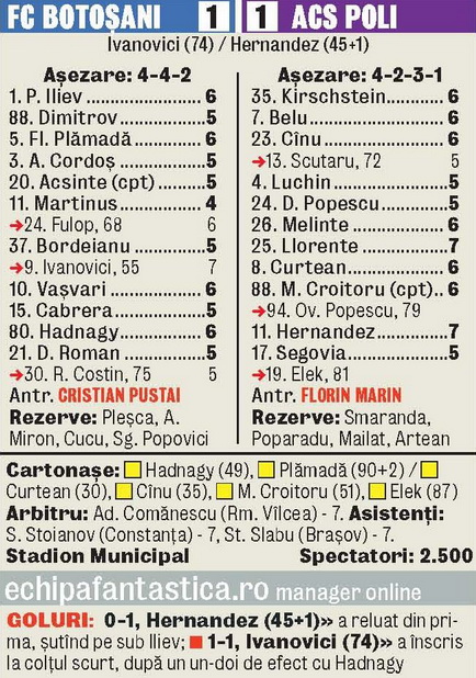 Echipa FC Botoşani a terminat la egalitate, luni, pe teren propriu, scor 1-1 (0-1), cu formaţia ACS Poli Timişoara, într-un meci din etapa a 16-a a Ligii 1. Oaspeţii au deschis scorul prin Javi Hernández, în minutul 45+1, gazdele reuşind egalarea prin Ivanovici, în minutul 74.