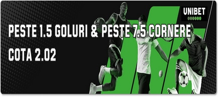 1. Peste 1.5 goluri marcate și peste 7.5 cornere, la o cotă de 2.02 oferită de Unibet în secțiunea Pariuri Combo